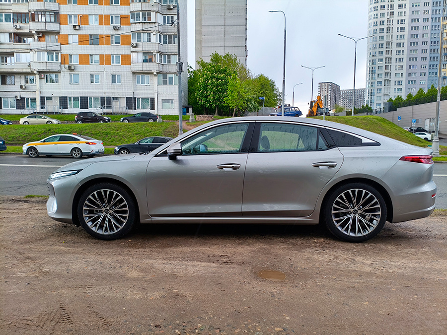 Особенно хорошо боковая линия смотрится в машине, обутой в 19-дюймовую резину. Как раз такая и стояла на тестовом образце. Она доступна при покупке комплектации Master. При этом у кузова очень вытянутая задняя часть, длина которой практически равна длине капота. Багажник открывается как в хэтчбэке: поднимается всё заднее стекло с небольшой крышкой багажника. При этом открывается очень глубокий багажный отсек, в который без проблем могут войти габаритные чемоданы. Единственный минус такого решения — это очень острый угол наклона заднего стекла. В отсутствии заднего дворника оно быстро становится непрозрачным даже при небольшом дожде, а ещё хуже — при снеге.