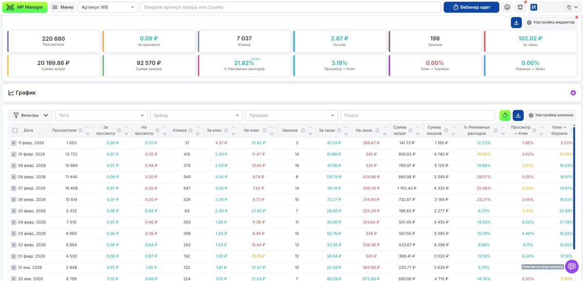 ? Самая частая боль селлеров: реклама «крутится», бюджет списывается, а понять причину просадки сложно: клики есть, а корзин нет; корзины есть, а заказов мало; заказы есть, а стоимость слишком высокая. Но реклама «сливается» не в отчёте. Она теряется внутри воронки: – много показов, но низкий CTR; – клики есть, а в корзину не добавляют; – корзины есть, но заказов мало; – показатели ниже рынка – и вы даже об этом не знаете. 📊 В разделе «Реклама → Аналитика» вы видите не просто цифры, а всю цепочку движения покупателя: показы → клики → корзины → заказы • CTR, CPC, ДРР, стоимость корзины и заказа • проценты на каждом этапе. И самое важное – сравнение с конкурентами: наведите курсор на метрику и увидите значение в вашей РК и среднее по конкурентам. Это сразу отвечает на вопрос: вы реально «проседаете» относительно рынка или проблема в другом (креатив, ставки, оффер, карточка). Это позволяет принимать решения не «по ощущениям», а по цифрам: менять креатив, дорабатывать карточку, корр