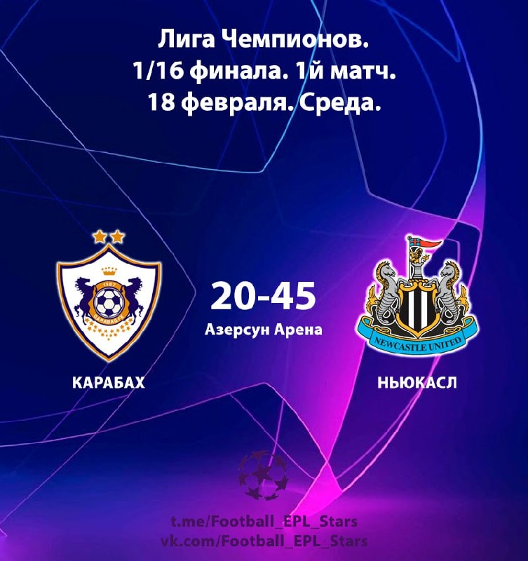 Сегодня 1/16 финала Лиги Чемпионов с участием английской команды. Карабах - Ньюкасл!