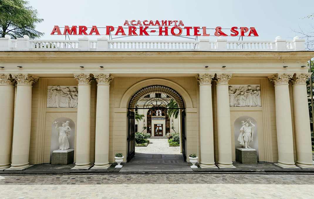 Это гостиница в Старой Гагре, которая располагается в здании санатория 17 съезда ЦК. Здание построено в стиле «сталинского ампира», что придает ему особую атмосферу. В то же время отель имеет роскошный интерьер, который приятно удивляет гостей своим изысканным декором. Гости «Amra» могут выбрать номера, обставленные в классическом стиле, либо отдать предпочтение более современным интерьерам. Отель способен одновременно принять до 300 гостей.