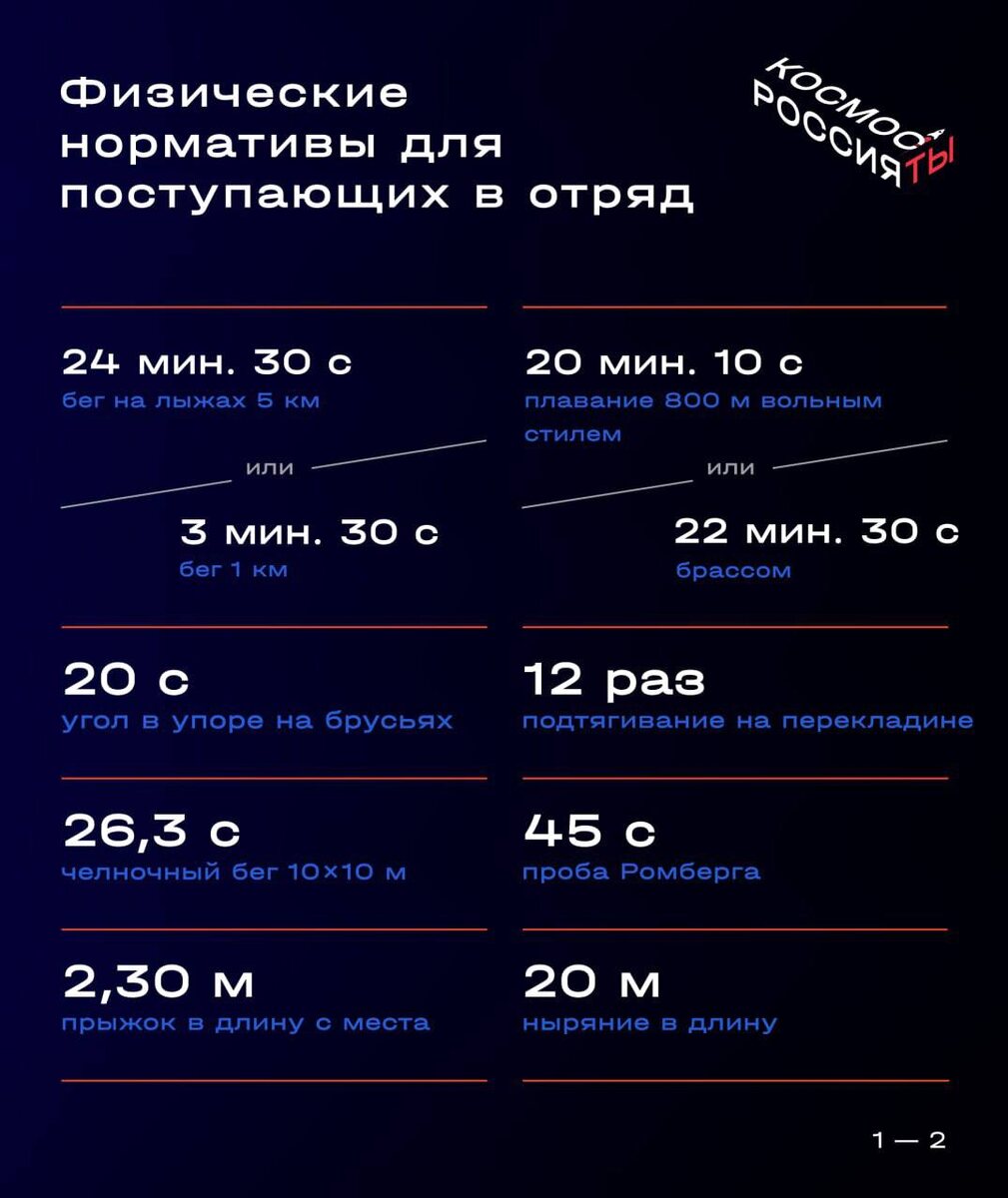 Если сбор документов на первом этапе отбора в отряд космонавтов — это проверка на верность мечте, то физические нормативы на втором этапе — суровая проверка на прочность. Выносливость, сила, ловкость, гибкость, устойчивость к перегрузкам, невесомости, гипоксии и вестибулярным раздражителям — для космонавтов это не просто качества, а строгие профессиональные требования. Чтобы подтвердить соответствие им, все претенденты должны сдать нормативы. 🔴Список нормативов — в карточках. Список документов для отбора Общие требования Таймлайн отбора Уже собрали документы для первого этапа отбора? 🔥— да 👍— в процессе ❤️— предпочитаю оставаться на Земле #статькосмонавтом2026@GagarinCosmonautTrainingCenter