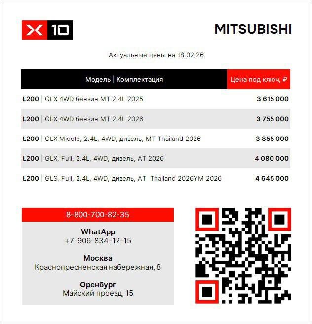 ) 🟢Обзор комплектации 2.4L, 4WD, бензин, MT, 2025 🟢Подробности комплектации Full Options, 2.4L, 4WD, дизель, AT 2026 🤑 Цены указаны с учётом растаможки и доставки в Москву. Подберем вариант под ваши задачи. Звоните: 📞 +7(800)700-82-35 бесплатно по РФ 📞 +7(919)868-97-47 Иван 📞 +7(922)856-66-66 Сергей (авто из Кыргызстана) 💬 MAX 💬 Telegram 💙 Сообщество в VK 🖥 Сайт 📍Оренбург, проезд Майский, 15 📍Москва, Краснопресненская набережная, 8 #x10прайс #mitsubishil200