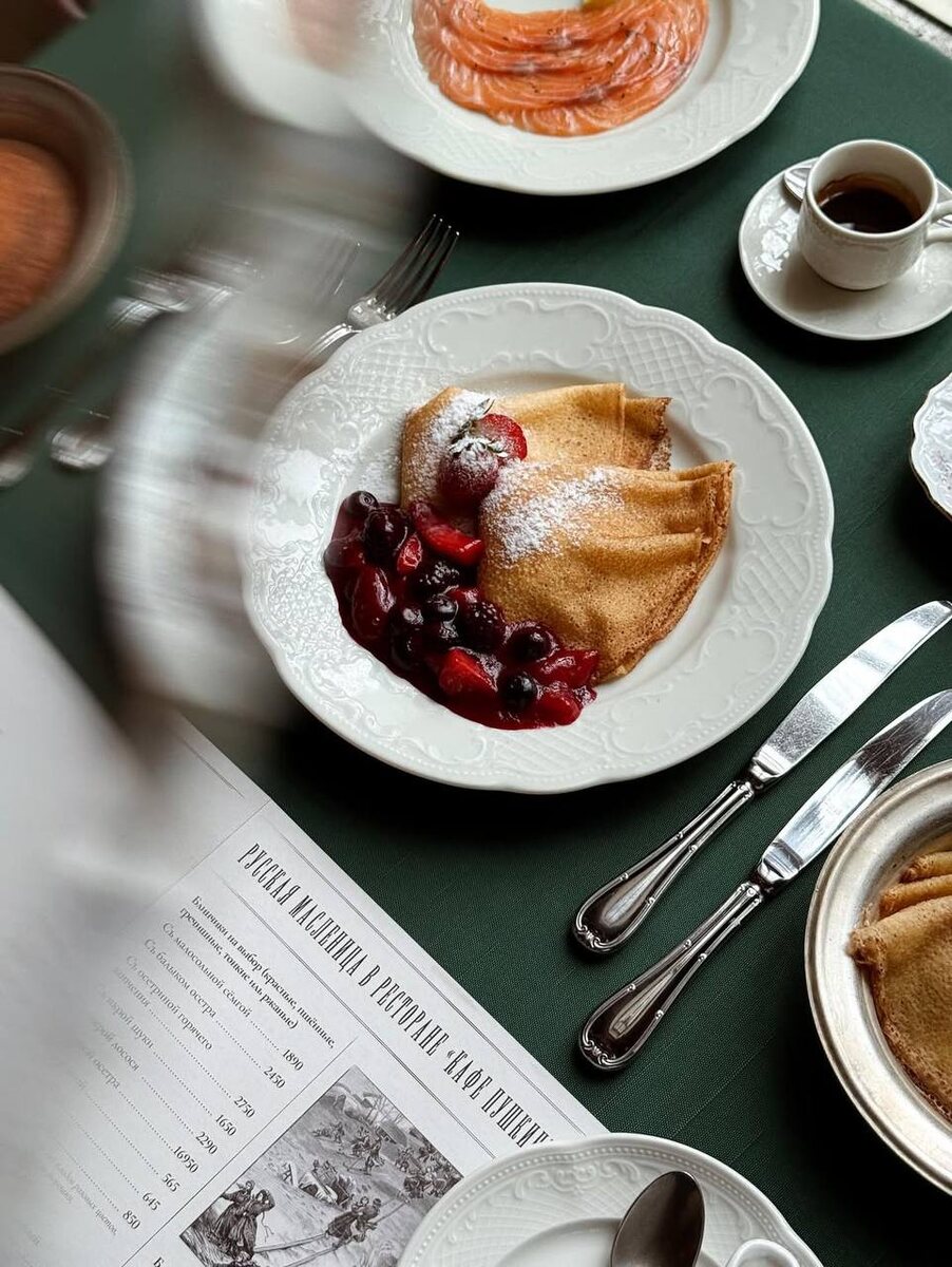 «Кафе Пушкинъ» приглашает Вас в дни масленичной недели попробовать блины из специального меню, в которое вошли пшеничные блины с красной и