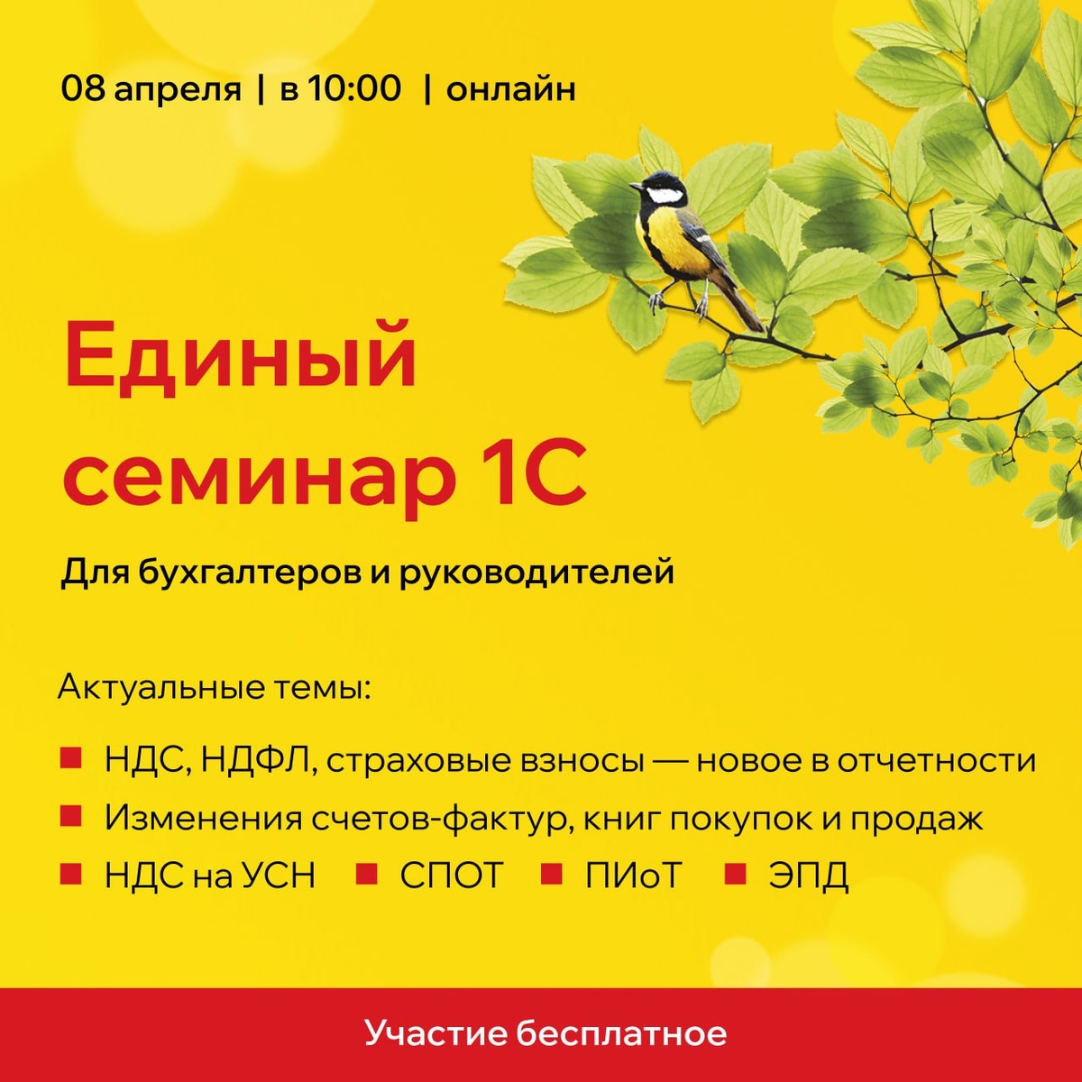 ! Компания «Софт-Юнити» приглашает вас на Единый семинар 1С! Практическое мероприятие, посвящённое важнейшим изменениям в законодательстве и их отражению в программах 1С. Всё, что необходимо знать бухгалтерам и предпринимателям 📅 08 апреля | ⏰ 10:00 (мск) | 💻 Онлайн ✏️ Ключевые темы семинара: 🟡 1С-Отчетность за 1 квартал – на что обратить внимание с учетом изменений налогового законодательства по НДС, НДФЛ и страховым взносам 🟡 Как в бухгалтерской отчетности отразить переход на НДС или изменение ставок НДС 🟡 Изменения форм и правил заполнения счетов-фактур и книг покупок и продаж: поддержка в 1С 🟡 НДС на УСН – ответы на часто задаваемые вопросы 🟡 150 новых критериев проверок контрагентов в 1СПАРК Риски для защиты бизнеса 🟡 Как упростить жизнь отделу кадров, бухгалтерии и сотрудникам с помощью мобильных расчетных листков 🟡 Система подтверждения ожидания товаров (СПОТ) – основные принципы, поддержка в 1С 🟡 ПИоТ для разрешительного режима в маркировке – рекомендации