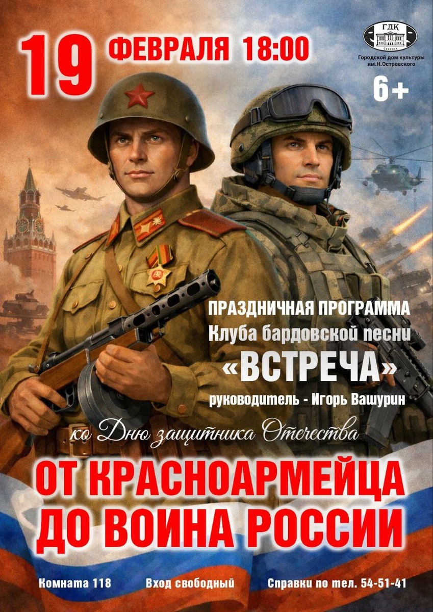 » «От красноармейца до воина России»: тем, кто стоит на защите рубежей нашей Родины, дарит свою праздничную программу клуб бардовской поэзии и песни «Встреча» под руководством Игоря Вашурина. Свою ретроспективу по основным этапам становления армии России коллектив условно назвал «Вперед, в прошлое!» - от современных Вооруженных сил РФ до Красной армии времен гражданской войны. На концерте в исполнении участников Клуба прозвучат песни как эстрадные, так и авторские – на стихи томских поэтов, бойцов СВО, песни советского времени, Великой отечественной и гражданской войн. Вход свободный. #СеверскАфиша