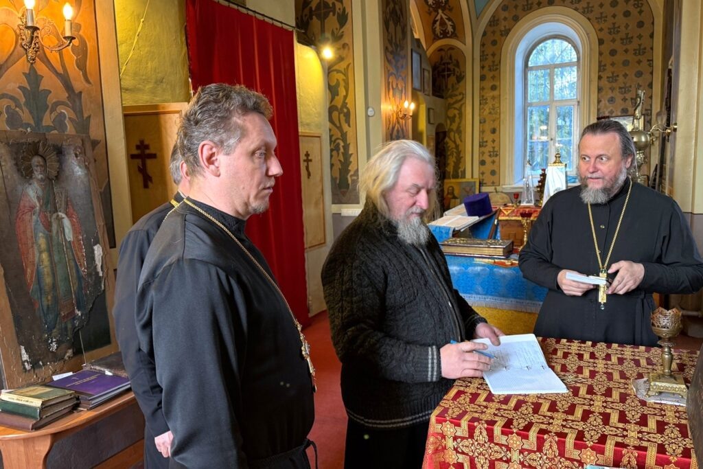 17 февраля 2026 года по благословению епископа Сергиево-Посадского и Дмитровского Кирилла в рамках работы Епархиального отдела по реставрации и строительству в Покровском храме села Ильино Дмитровского благочиния состоялась выездная работа по описи движимого церковного имущества, которое имеет художественную, культурную и историческую ценность. В работе приняли участие: председатель Епархиального отдела по реставрации и строительству, благочинный Дмитровского церковного округа протоиерей Афанасий Чорногуз, епархиальный древлехранитель протоиерей Ростислав Шишов, эксперты: протоиерей Андрей Крашенинников, иеромонах Симеон (Родионов) и настоятель Покровского храма иерей Алексий Гришанов.