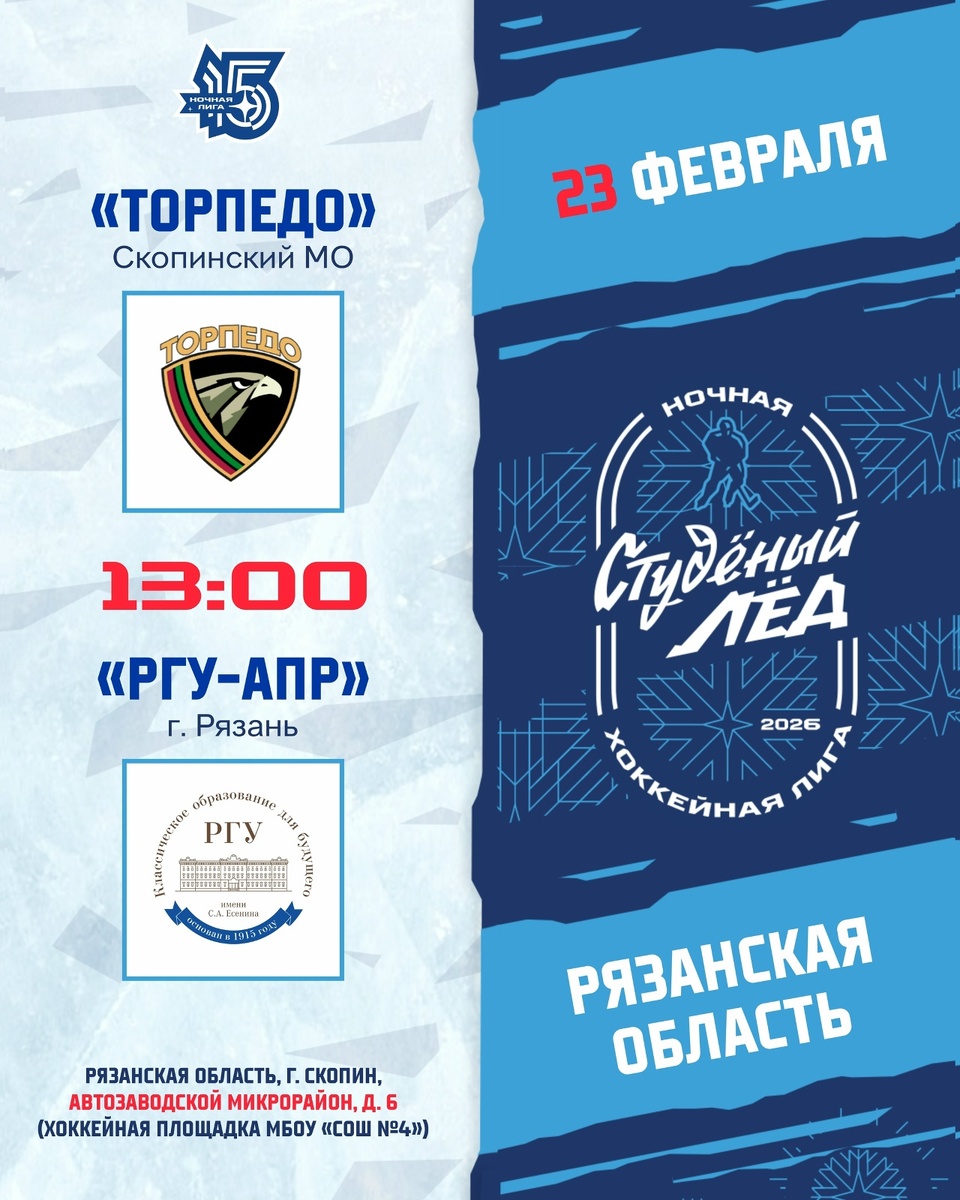 В Скопине пройдет хоккейный матч в рамках проекта «Студёный лед». Об этом сообщили в ХК «Рязань-ВДВ». 23 февраля 1951 года в Скопине состоялся первый в истории Чемпионат области по хоккею с шайбой, в котором участвовали три команды: «Шахтер» (г. Скопин) и рязанские «Динамо» и «Спартак». Спустя 75 лет, в эту же дату, 23 февраля, в 13:00 на открытой ледовой площадке в Скопине пройдет матч между командами Ночной хоккейной лиги, выступающими в дивизионе «Лига Надежды», «Торпедо» (Скопинский МО) и «РГУ-АПР» (г. Рязань). Встреча состоится в рамках всероссийского проекта «Студеный лед». Матч пройдет на хоккейной площадке МБОУ «Средняя общеобразовательная школа № 4» по адресу: Скопин, Автозаводской микрорайон, дом № 6. Помимо матча, болельщиков ждут конкурсы, выступление артистов, полевая кухня и другое. Возрастное ограничение — 18+.