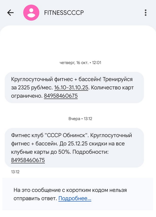 В Калужское УФАС России поступило обращение от жителя Обнинска, который пожаловался на рекламные сообщения в SMS о фитнес-услугах. Гражданин отметил, что не давал разрешения на получение такой рекламы. УФАС выяснило, что рассылки осуществлялись от имени абонента под названием «FITNESSCCCP». Эти SMS были разосланы в соответствии с дополнительным соглашением между «ВымпелКом» и компанией «Спорт Сооружение Обнинск». Компания Билайн ("ВымпелКом") в своё оправдание сообщила, что на момент заключения договора между абонентом и компанией в договоре было указано условие, что компания вправе вносить в условия договора изменения, которые публикуются в СМИ, что и было сделано. В "Российской Газете" в 2009 году была опубликована новая версия договора об оказании услуг связи "Билайн", в соответствии с которой абонент автоматически соглашается с получением рекламных сообщений, если не напишет письменный отказ. Абонент даже не знал, что надо прочитывать все газеты, чтобы узнавать об изменениях в дог