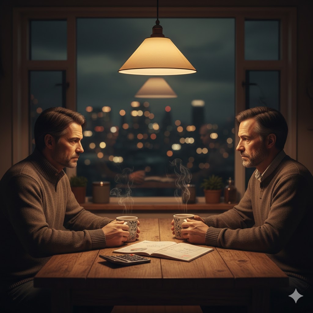 Уютная домашняя кухня вечером, двое мужчин средних лет сидят за деревянным столом, пьют чай из простых кружек, за окном тёмный город с огнями, тёплый свет лампы создаёт атмосферу доверительного разговора, на столе лежат раскрытый блокнот с цифрами и калькулятор, лёгкая задумчивость на лицах, стиль реалистичной фотографии с кинематографичным освещением, глубина резкости, тёплые тона, уют и лёгкая ностальгия.