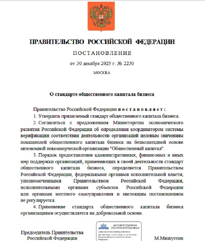 Председатель правительства Российской Федерации Михаил Мишустин подписал постановление об утверждении Стандарта общественного капитала бизнеса – единого инструмента оценки участия компаний в достижении национальных целей развития.