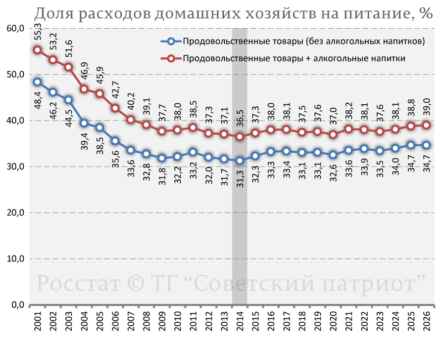 Заголовок получился запутанным из-за того, что я сознательно использовал в нём выражения из чиновного новояза последних лет, используемый для того, чтобы запутать россиян и скрыть от них реальное положение дел в стране. Так появились замечательные словесные конструкции, как "отрицательный рост", "компактный урожай" или самое свежее изобретение -- "тактическая бедность". Видимо, подразумевая под этим выражением временное снижение "стратегического богатства дорогих россиян. Но если отбросить всё это словоблудие и обратиться к Росстату, то даже этот лукавый орган не может скрыть факты роста бедности россиян. Так согласно самым свежим данным о структуре расходов российских домохозяйств доля расходов, потраченных на питание достигло 39%, что стало самым большим значением с 2014 года, когда эта доля была минимальной: Этот показатель говорит о том, что россияне за этот период стали тратить большую долю своих доходов на питания и меньшую на всё остальное, а значит стали беднее. Для понимания я