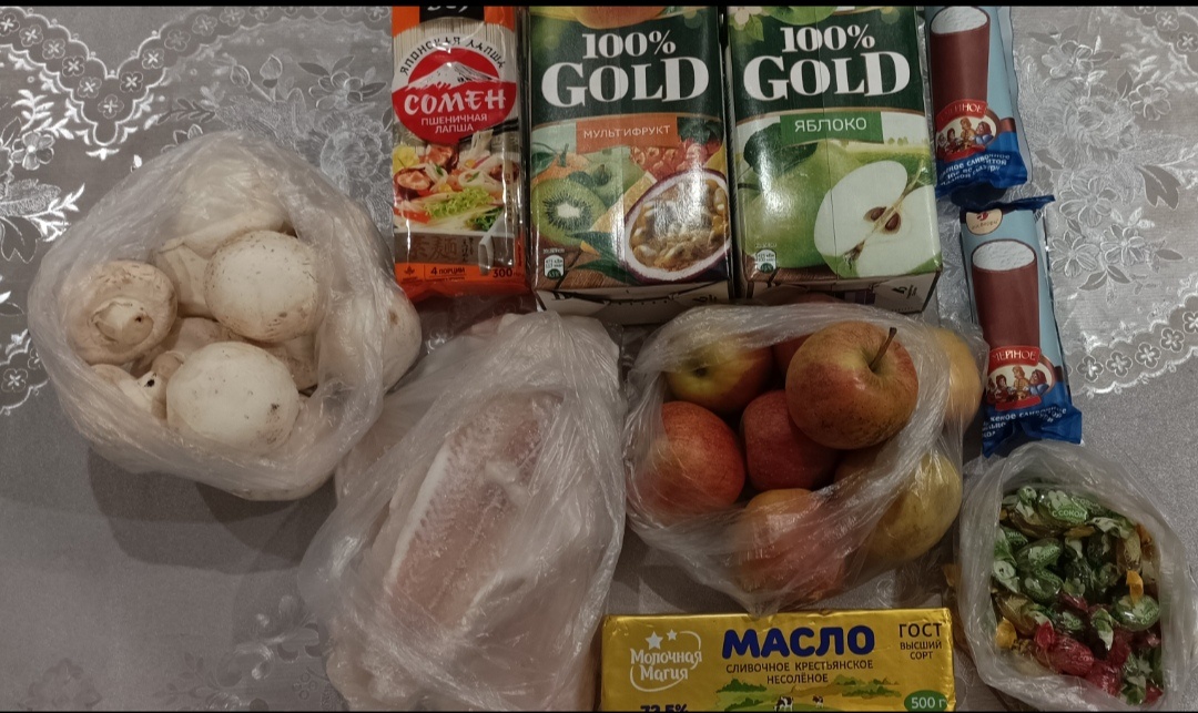Сок взяла двухлитровый, это для Дим Димыча праздника. Лапшу опять такую наподобие, только у меня была в чёрной пачке. Мороженку дети выпросили. Обещали дождаться, когда подтает и есть потихоньку, чтобы опять не заболеть).
