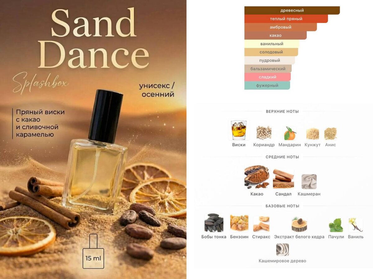🤩🤩🤩🤩🤩🤩🤩🤩🤩🤩 🤩🤩🤩🤩🤩🤩 🤩🤩🤩 🤩🤩🤩🤩🤩🤩🤩🤩🤩🤩 Всем привет! 🤩🤩 🥃 Sand Dance - пряный виски с какао и сливочной карамелью 🌟 Арт. 605418393 💙 Арт. 3129046255 🤩 Аромат-референс: Sand Dance Stéphane Humbert Lucas 777 🤩 Пирамида: Верхние ноты: Виски, Кориандр, Мандарин, Кунжут и Анис Средние ноты: Какао, Сандал и Кашмеран Базовые ноты: Бобы тонка, Бензоин, Стиракс, Экстракт белого кедра, Пачули, Ваниль и Кашемировое дерево 🤩 Звучание: 🤩Верхние ноты Открытие аромата - это увлекательный коктейль, наполненный виски, который придаёт композиции глубину и лёгкую алкогольную нотку. Кориандр и мандарин добавляют зелёную пряность и цитрусовую свежесть, а кунжут и анис вносят пряные, ореховые акценты, которые создают интересное и многогранное начало. 🤩Средние ноты В сердце аромата раскрываются более тёплые и уютные ноты. Какао добавляет сладкую, слегка горькую глубину, а сандал и кашмеран дарят мягкие древесные и мускусные акценты, создавая атмосферу комфорта и роско