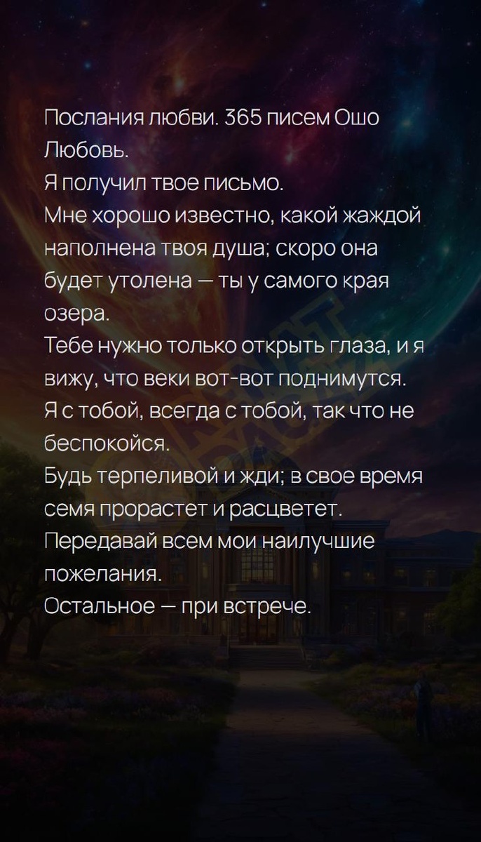 365 писем Ошо Любовь. Я получил твое письмо. Мн... Послания любви. 365 писем Ошо ✨ Любовь. ✨ Я получил твое письмо. ✨ Мне хорошо известно, какой жаждой наполнена твоя душа: скоро она будет утолена — ты у самого края озера. ✨ Тебе нужно только открыть глаза, и я вижу, что веки вот-вот поднимутся. ✨ Я с тобой, всегда с тобой, так что не беспокойся. ✨ Будь терпеливой и жди: в свое время семя прорастет и расцветет. ✨ Передавай всем мои наилучшие пожелания. ✨ Остальное — при встрече. Натальная карта | Матрица судьбы T | VK | Pin | YouTub | Dzen #прорыв #осознанность #процветай #доход #эволюция #новаяжизнь #внутренниймир #советдня #радость #18число #18февраля