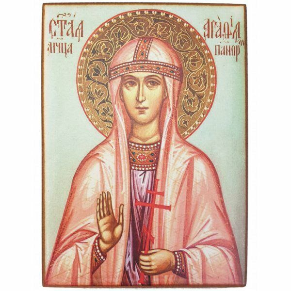 благочестии. Наступило гонение Декия. Правитель области Квинтиан, увлеченный красотою юной христианки, решил отвлечь ее от христианской веры и с этой целью поместил ее в дом одной язычницы-вдовы, проводившей беспутную жизнь. Однако жизнь в языческом доме, среди веселья и роскоши не расположила к себе святую Агафию. Не помогли также и увещевания языческой вдовы. Видя это, правитель задумал прибегнуть к более решительным мерам. Он стал допрашивать Агафию, почему она не кланяется идолам. Святая ответствовала: – Ваши идолы не боги, а бесчувственные чурбаны, и сами вы рабы этих чурбанов. Раздраженный Квинтиан подверг святую Агафию жестоким мучениям и затем заключил в темницу. Видя, однако, ее непреклонность, он велел рвать клещами ее грудь. Когда потом Агафию бросили в темницу, то ей явился апостол Петр и исцелил ее раны. Необычайный свет при этом озарил темницу; воины, испуганные этим, разбежались. Святая Агафия, однако, этим не воспользовалась, покорно ожидая мученического венца. На пя