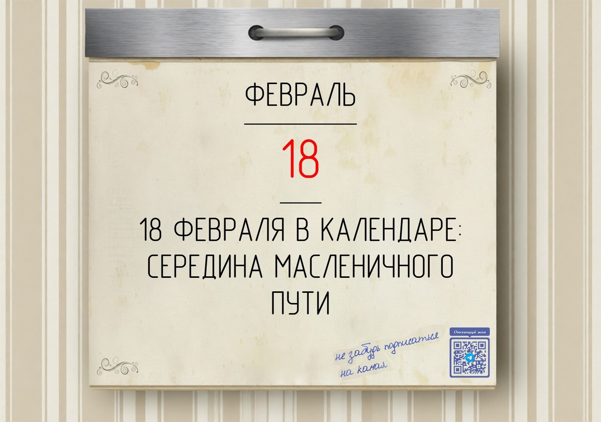 Сегодня, 18 февраля 2026 года, среда — середина Масленичной недели и её третий день, который носит вкусное название «Лакомка». Это последний день Узкой Масленицы, после которого с четверга начнётся Широкая Масленица — время всеобщих гуляний. Профессиональный праздник: День транспортной полиции России. Православный календарь: Продолжается Сырная седмица (Масленица), мясо уже не вкушают, разрешены молочные продукты. Народный день — Лакомка. Главная традиция — тёщи приглашают зятьев на обильные угощения, особенно на блины. Именины по церковному календарю сегодня отмечают Александра, Анна, Василиса, Макар, Михаил, Феодосий. Всем хорошего дня, сытной «Лакомки» и тёплых семейных встреч! #Календарь #МасленичнаяСреда Подписаться https://t.me/+NbMdPCbn1F40Y2Ni