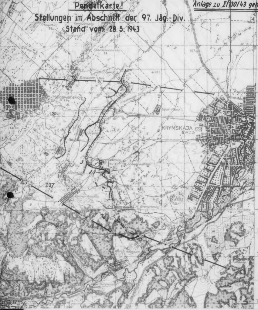 10-45 Adj. Gef. Gruppe Malter meldet: «Замечено движение противника из Мелеховского в Крымскую, численностью в 1 батальон с 3 танками, еще один танк буксируется. Перед фронтом интенсивное движение грузовиков, позади ложбины от табачной плантации на юг. На отметке 114,1 в течение получаса наблюдался очень сильный артиллерийский огонь (очень тяжелых калибров). Все противотанковые орудия, кроме одного, вышли из строя из-за того, что засыпаны землей. Их можно будет откопать только ночью».