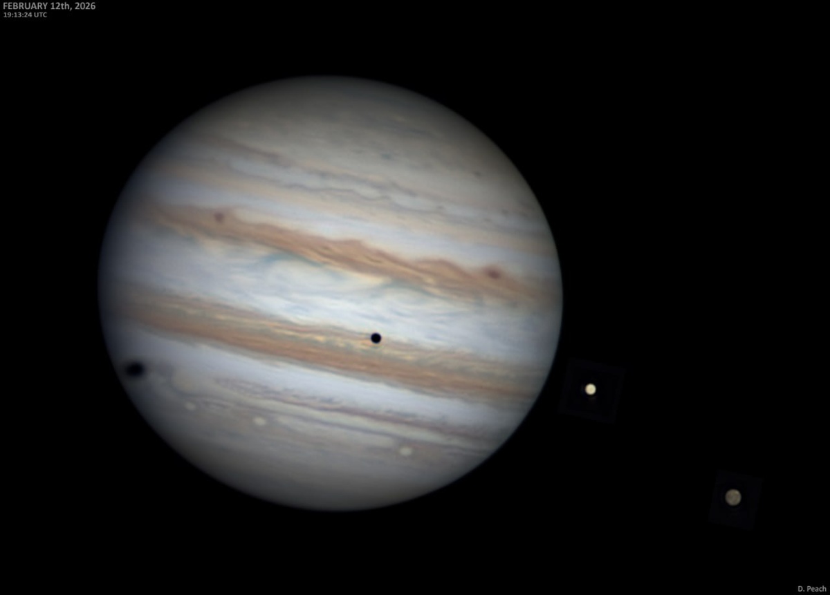 Астрофотограф-любитель Damian Peach запечатлел редкое событие - двойной транзит теней Европы и Каллисто по диску Юпитера 12 февраля 2026