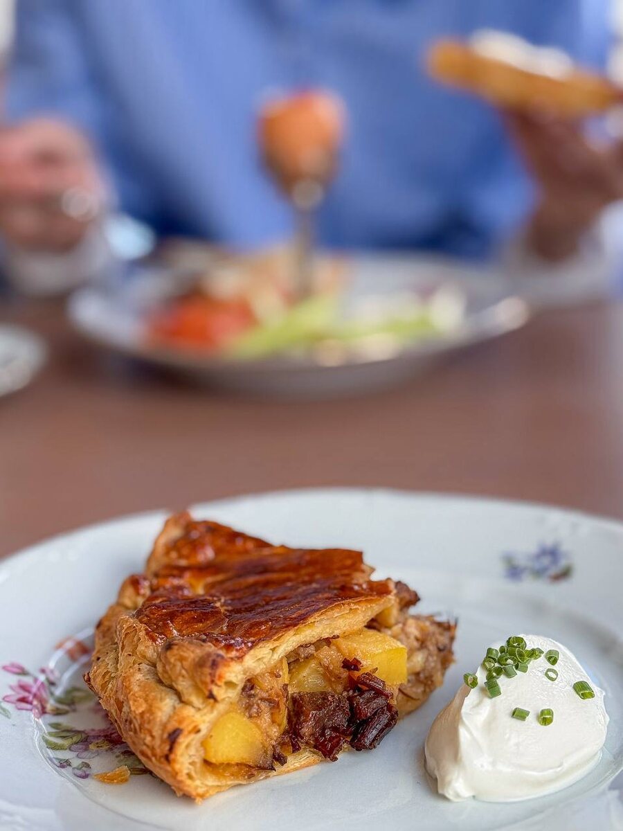 Иногда мы себя балуем. Например, после продуктивной утренней встречи едем на завтрак в La Volte. А там сейчас не только поздние завтраки из основного меню, но и масленичный спешл: пастуший пирог, блинный торт с черникой и маком, блины с тремя видами сыра. Сегодня взяли «Завтрак №2» из базового меню плюс пастуший пирог и блинный торт из спешла на пробу. Пастуший пирог - это, наверное, лучший пирог, который пробовал Илья. Да, он всё ещё мечтает где-нибудь снова встретить ирландский пирог с почками, но этот значительно деликатнее. Внутри - печёный картофель и томлёная говядина. Сверху - нежнейшее слоёное тесто с таким золотистым колером. Потрясающая позиция. Хочется сразу заказать еще кусочек. 12-слойный блинный торт - это где тонкие блинчики чередуются с крем-чизом двух цветов: черничным и белым. Сверху клубничный компоте. Конструкция по структуре напоминает кулебяку. По вкусу - попадание 17 из 10. А «Завтрак №2» доставил отдельное эстетическое удовольствие: яйца подали как в «Бремен