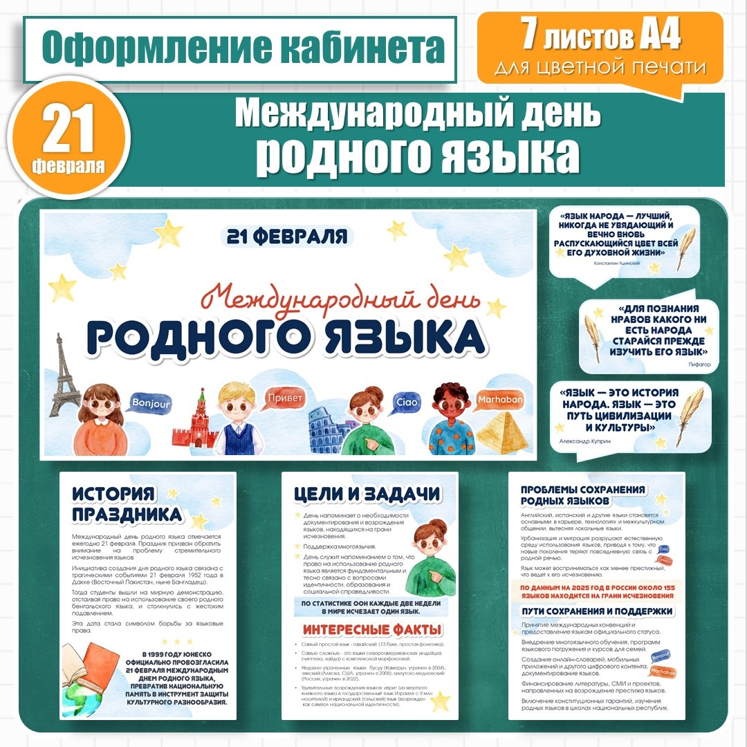 21 февраля отмечается Международный день родного языка. Главная цель праздника — напомнить о необходимости защиты языкового разнообразия, которое обогащает глобальную культуру и способствует взаимопониманию между народами. Разработка предназначена для оформления стен, информационных стендов, доски в качестве наглядной базы для проведения тематических уроков и внеклассных мероприятий. Состав комплекта: 2. Информационные плакаты (3 листа, каждый формата А4): 3. Речевые облачка с цитатами (3 шт. на 1 листе А4) о родном языке. Общий объем для цветной печати 7 листов формата А4. Дизайн выполнен в акварельной стилистике, с минимальным использованием фона для экономии расходов на печать. Можно заламинировать материалы для обеспечения их долговечности и возможности многократного использования, учитывая, что дата праздника не меняется (21 февраля). Скачать материал по подписке Инфоурок: Оформление День родного языка. Приглашаю Вас в свое сообщество в ВК: Есть идеЯ!