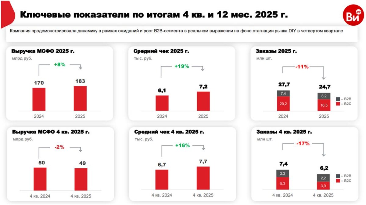 По данным «Ъ», крупнейшие DIY-сети за 2025 год увеличили оборот всего на 4,5–8%. Такая скромная динамика обусловлена охлаждением экономики и строительного сектора в частности. Предлагаю сегодня посмотреть на операционный отчет ВИРУ (ВсеИнструменты. ру), дабы удостоверится: выплата дивидендов - это следствие улучшения сентимента или имитация благополучия. 🧰 Итак, выручка по итогам 2025 года составила около 183 млрд рублей, рост +8% г/г. Формально мы уложились в общеотраслевой тренд, но есть ряд важных моментов. Основной драйвер - B2B-направление, где выручка выросла на 16% до 136 млрд рублей. B2C, напротив, просел на 13% до 45 млрд рублей. В итоге доля B2B в товарной выручке перевалила за 75%. Становится понятно, что массовый DIY компании уже неинтересен, ставка сделана на корпоративных клиентов и профессионалов. Дальше - интереснее. Количество заказов за год сократилось на 11%, а в четвертом квартале падение ускорилось до 17%. В B2C сегменте вообще все грустно: минус 18% заказов за го