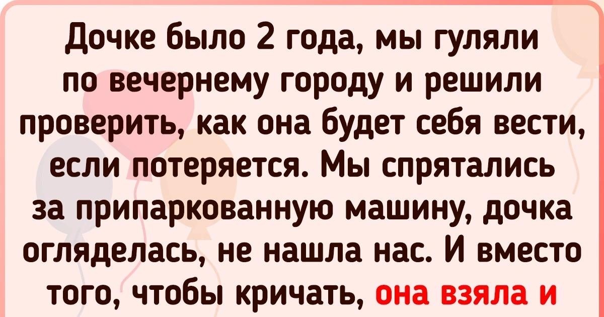 “Дочке было 2 года, гуляли вечером. Мы спрятались за машиной, а она не закричала и не растерялась, а просто пошла домой сама. Вот это сообразительность в два года!”