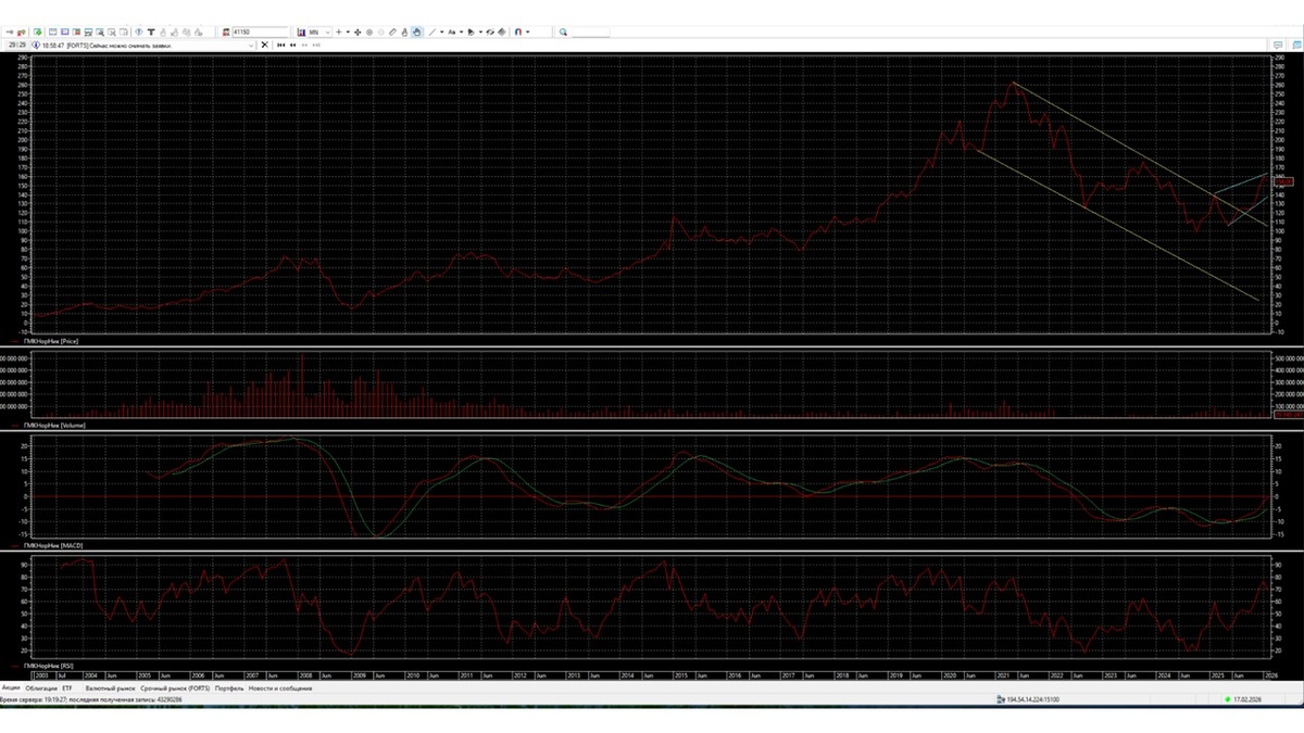 Новостной фон ухудшается, рубль находится в коридоре 80-85, цена на металлы понижает свои уровни. Центральный банк РФ отказался понижать ставку до апреля, компания ГМКНорНик оповещает инвесторов и акционеров о невозможности выплатить дивиденды в 2026 году. По причине экономических трудностей в компании и падения спроса на медь и никель на международных рынках. К концу февраля акция достигает уровень 140 и пробивает его. К середине марта берет курс на уровень 130, к концу марта пробивает уровень 130 или достигает уровня 120.