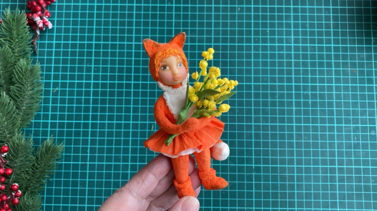 Моя лисичка – это маленькая куколка, высотой до 12 см, стоит самостоятельно, но подвес, чтобы разместить игрушку в ветвях ели, имеется.