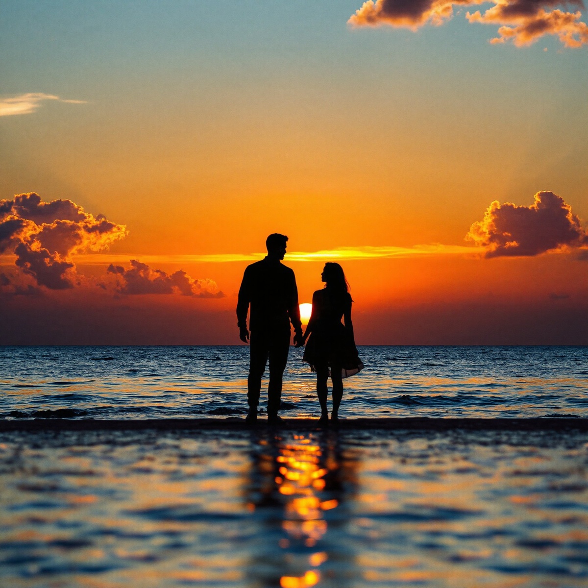 Промт 1: Реалистичный закатный портрет пары: пара на берегу моря в закате, силуэты держатся за руки, солнце на горизонте, небо градиентом от золотого к глубокому оранжевому, отражение в воде, песок мокрый, реалистичное освещение, детальная текстура кожи и одежды, кинематографический кадр; --ar 3:2 --v 5 --q 2 --stylize 600