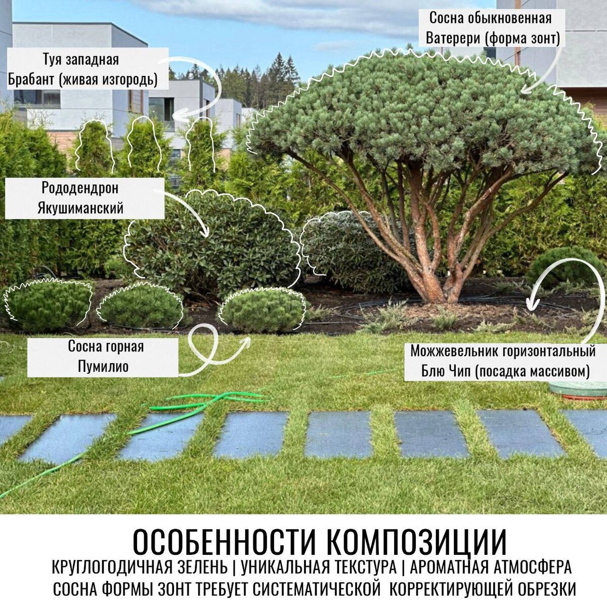 Хвойные растения, наряду с крупномерными лиственными деревьями, составляют каркас сада. Они дарят структуру, цвет и жизнь в любое время года, особенно в безлиственный период 🔖В нескольких постах мы разберем три акцентные, парадные композиции из вечнозеленых растений Пожелание заказчиков – посадка ТОЛЬКО хвойных растений – оказывается очень интересной задачей – в итоге получаются нескучные, особенные уголки сада, где все композиционные решения выполнены только засчет представителей хвойных пород 🔴Мы знаем, как растения будут выглядеть через 5-10 лет — учитываем конечные размеры, чтобы композиция не превратилась в чащу 🔴Подбираем «соседей» по агротехнике — чтобы всем растениям в группе было комфортно (свет, почва, влага) 🔴Создаем не набор растений, а законченную картину — с учетом вида из окна, розы ветров и стиля всего участка Вот один из примеров На этом фото вы видите, как сочетание различных форм, высот и текстур создает эффектную и живописную картину