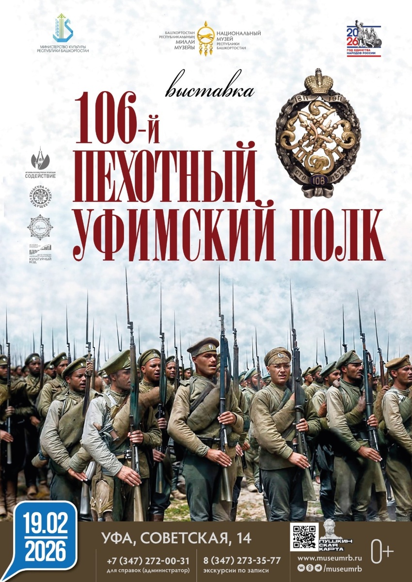 19 февраля в Национальном музее Башкортостана стартует выставка, посвященная 106-му пехотному Уфимскому полку. 19 февраля в Национальном музее Башкортостана стартует выставка, посвященная 106-му пехотному Уфимскому полку. Легендарное воинское формирование было создано более 160 лет назад — 13 августа 1863 года, а спустя год, 25 марта 1864-го, получило наименование «106-й пехотный Уфимский». Как рассказали в пресс-службе музея, экспозиция готовилась долгих 11 лет. Историк из Уфы Ильдар Гатауллин и коллекционер из Белорецка Дмитрий Николаев впервые представят широкой публике уникальные артефакты, многие из которых ранее нигде не выставлялись. В центре выставки — подлинные свидетельства эпохи: раритетные фотографии и открытки, подлинное обмундирование, награды и книги начала XX века, документы, рассказывающие о доблести офицеров и рядовых. Ключевой раздел экспозиции посвящен подвигу полка в феврале 1915 года. Окруженные превосходящими силами неприятеля, уфимцы не дрогнули: они бились до п