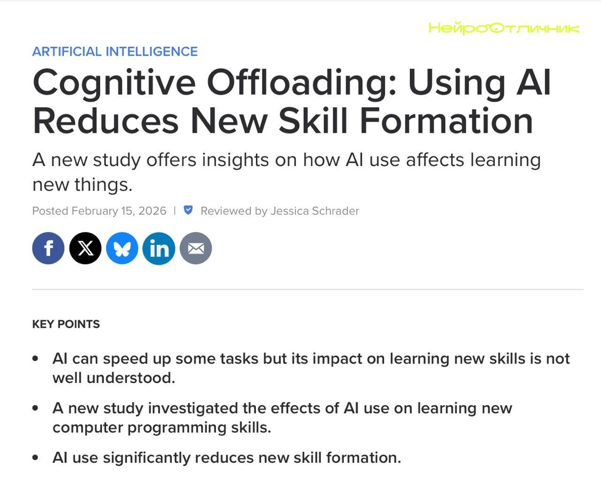 ИИ часто воспринимается как помощник в обучении, но исследование Psychology Today показывает: не всегда это так. Он ускоряет задачи, но снижает вовлечённость мозга. В тесте по освоению сложного ПО группа с ИИ показала результат на 17% хуже. Особенно плохо справлялись те, кто просто заставлял ИИ писать код. Зато те, кто просил ИИ объяснить код, учились лучше — ИИ эффективен, когда учит думать, а не делает всё за тебя. Иногда стоит дать мозгу самому поработать. 🌴🤖 Что вы думаете о помощи ИИ в учебе? Подписывайтесь! #ИИ #обучение #нейроэффективность #психология #технологии www.neurootlichnik.ru