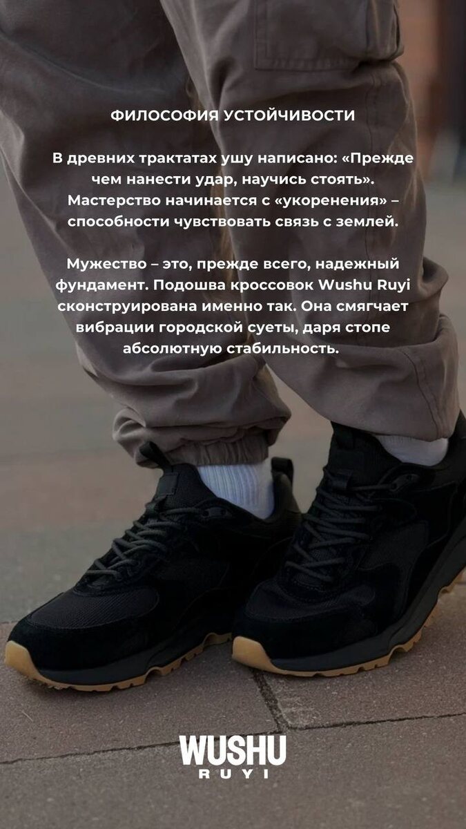 Это способность пройти свой путь до конца, не потеряв достоинства и стиля. Итальянский бренд Wushu Ruyi родился на стыке двух великих культур: китайской философии ушу и миланской эстетики. В преддверии праздника мы подготовили карточки о том, как правильная обувь формирует характер победителя. Листайте, чтобы узнать, почему Wushu Ruyi – это не просто кроссовки —> Выбрать кроссовки на сайте #wushuruyi #вушуруй #мужскиекроссовки #женскиекроссовки #спортивныекроссовки #повседневныекроссовки #подароклюбимым #подароксебе