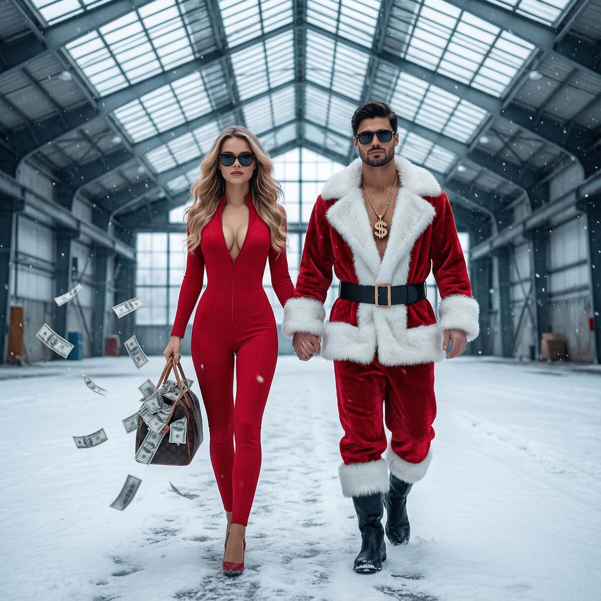 Модель: Nano Banana Сгенерировать🪄 Используй лица мужчины и женщины с загруженных фото. Фотореалистичное 8K фото: зимний индустриальный ангар со стеклянной крышей, холодный дневной свет, мягкий контровой, падающий и лежащий снег. В центре мужчина и женщина идут вперёд, держась за руки; камера на уровне груди, лёгкий нижний ракурс, симметрия, резкий фокус, малая ГРИП. Женщина — красный облегающий комбинезон с глубоким V, тёмные очки, мешок с наличными, купюры летят. Мужчина — костюм Санты с мехом, чёрный ремень и сапоги, золотая цепь с долларом, тёмные очки. Реальные текстуры, HDR, без стилизации. Identity lock: оба лица строго соответствуют своим референсам, без искажений и изменений.