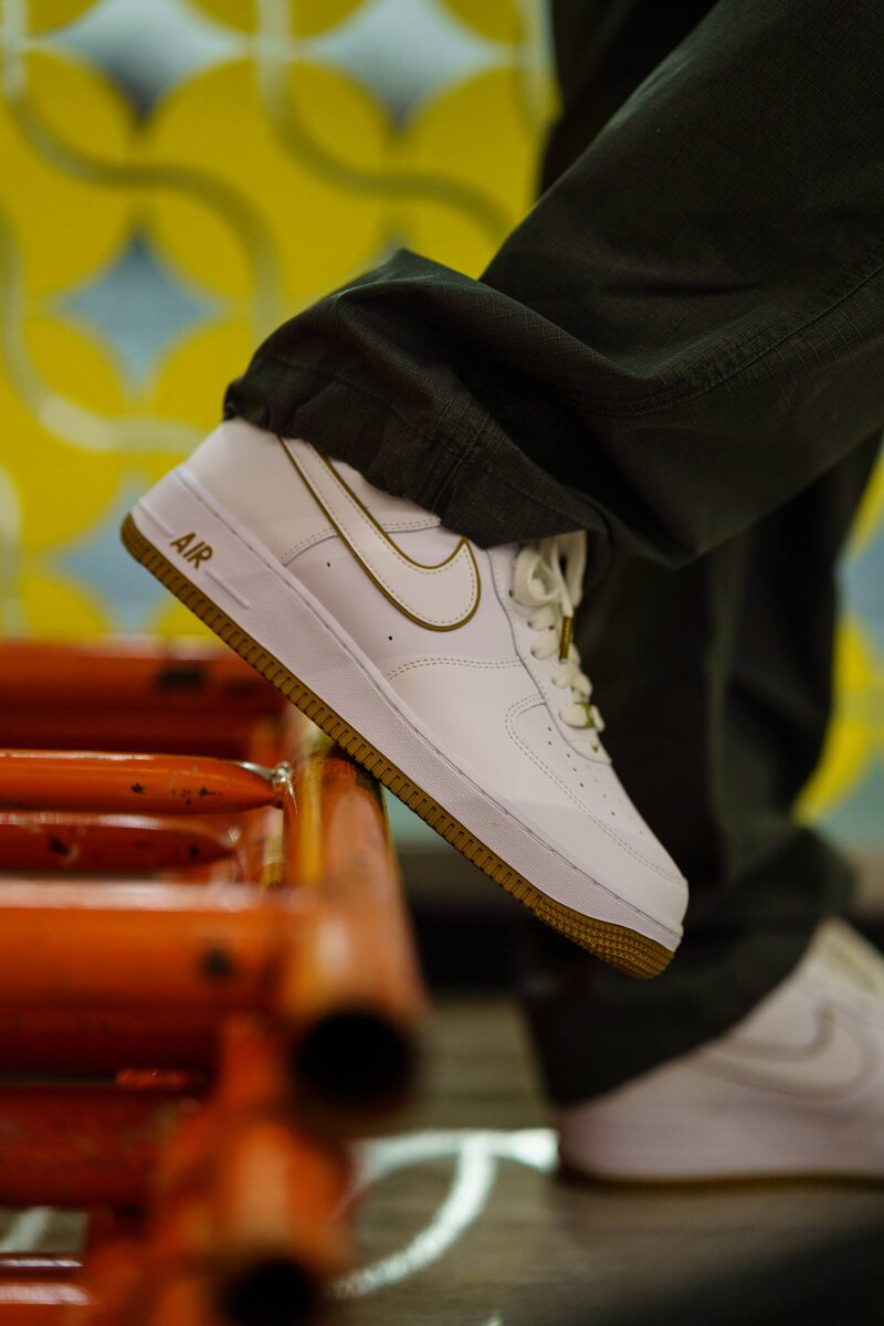 Белый кожаный верх остается верен оригиналу 1982 года, но в этой версии все строится вокруг аккуратных золотистых штрихов. Тонкая окантовка свуша, металлический дубрэ на шнурках и контрастная gum-подошва добавляют паре глубины, не перегружая силуэт.