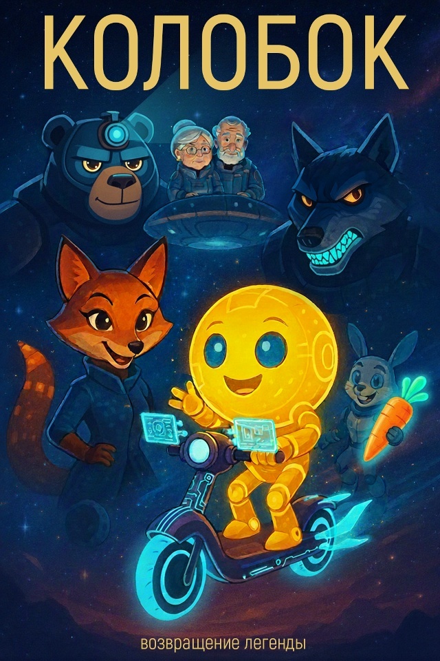 Жили-были на далёкой планете Земля-Бета старик-изобретатель и старуха-программистка. У них был умный дом, старый ржавый космический корабль в ангаре и пылесос, который иногда разговаривал во сне и жаловался на пыль. Однажды говорит старик: — Эх, смастерила бы ты, бабка, помощника. Скучно тут вдвоём! — Да из чего мастерить-то? Детали кончились! — А ты поищи в корабле! По отсекам поскреби, по ангару помети. Авось что-нибудь и найдётся! Старуха по отсекам поскребла, по ангару помела, нашла две блестящие шестерёнки, солнечную батарею и почти новое голографическое ядро. Собрала робота — круглого, весёлого, с огоньком в глазах. — Ах, какой Колобок! — обрадовались старики. Запрограммировали его на доброту и поставили заряжаться под звёздный свет. Колобок полежал-полежал, зарядился, подключился к интернету Галактики и сказал: — Привет! Я Колобок. Убегаю от вас — хочу поиграть в космические игры! И покатился: с подоконника на диван, с дивана на пол, через шлюз — и прямо к ракете во дворе! Ракет