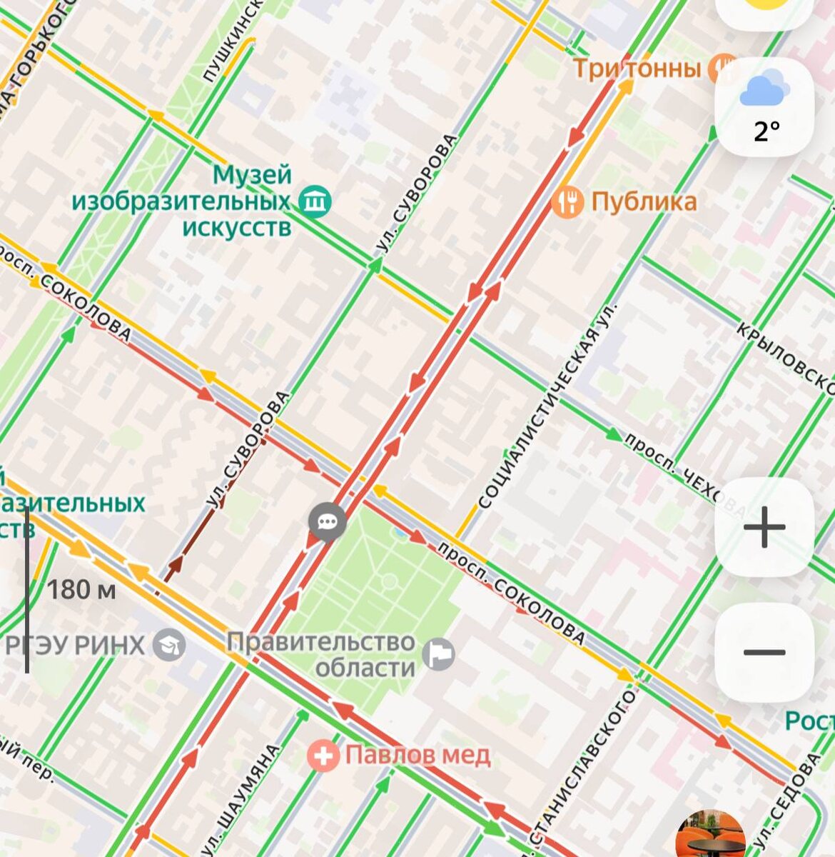 Затор растянулся от Ворошиловского проспекта до музтеатра.