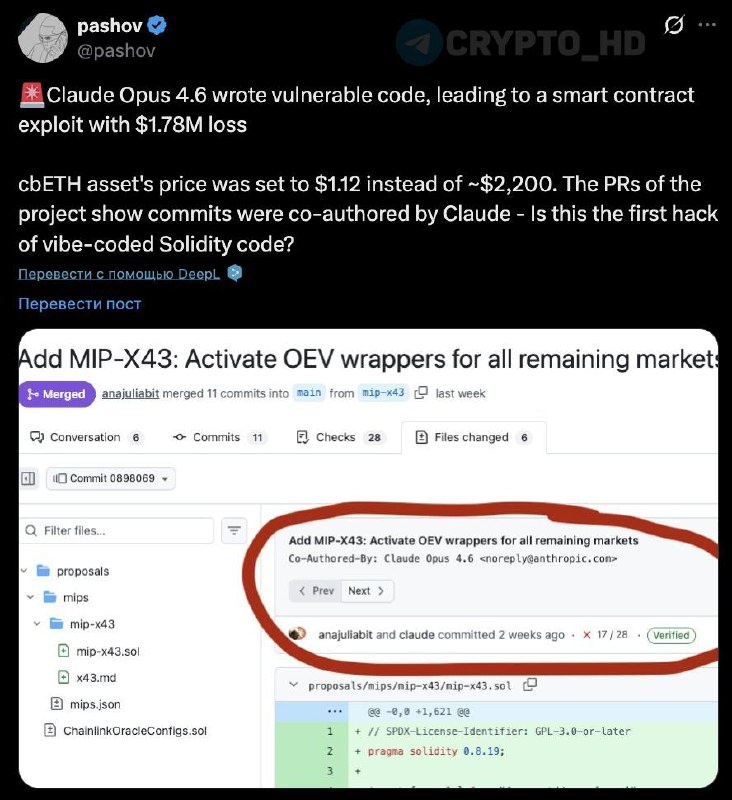 ❌ Протокол Moonwell взломан на $1,78m из-за ошибки AI. Уязвимый код был сгенерирован моделью Claude Opus 4.6. Баг в формуле оракула ценообразования привел к тому, что цена #cbETH была указана как $1,12 вместо реальных ~$2200. Crypto Headlines