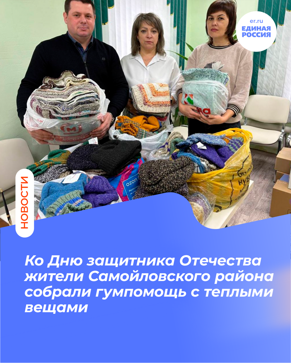 Активисты Единой России и члены женсовета Самойловского района доставили от жителей коробки и пакеты с продуктами длительного хранения, средствами личной гигиены, сладостями. Учащиеся местной школы тоже не остались в стороне: они написали трогательные письма с поздравлениями и тёплыми пожеланиями для наших героев.