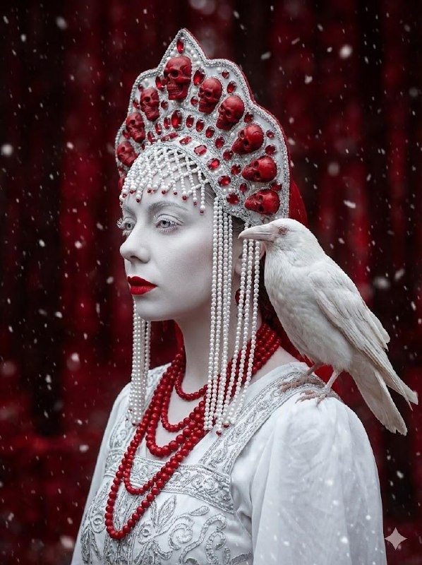 Промтп: Портрет в профиль мистической бледной колдуньи-альбиноса. У нее белые ресницы и ярко-красные губы. Она одета в белое платье с серебряной вышивкой и крупные красные бусы. На голове сложный кокошник, украшенный красными черепами, рубинами и жемчужной бахромой. На ее плече сидит белый ворон-альбинос. Фон: темно-красный размытый лес, падающий снег. Высокий контраст красного и белого, готическая эстетика, пугающая атмосфера, высокая детализация. Банк промтов | Твои идеи