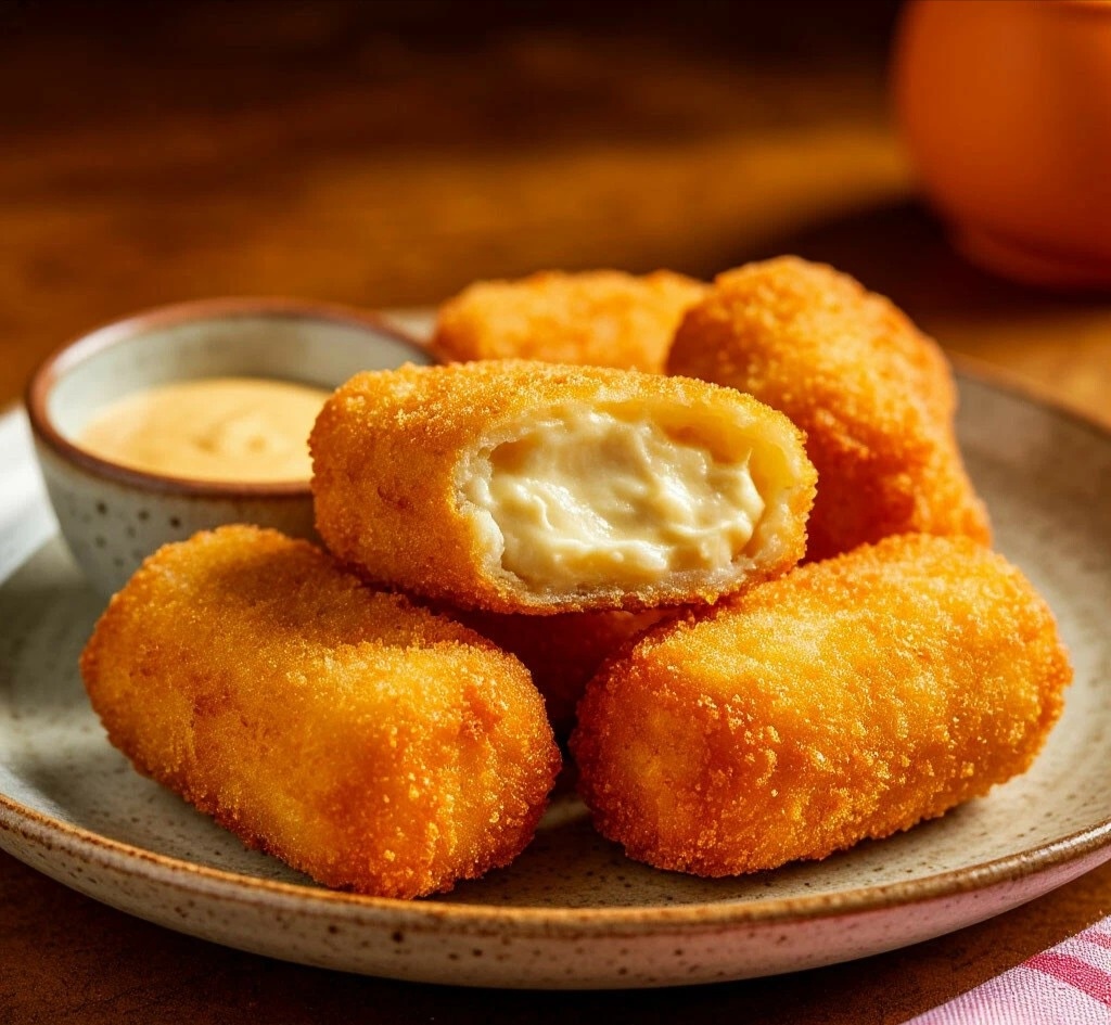 8. Фритюр. Разогрейте масло для фритюра (или налейте в сковороду слой 1,5–2 см). Обжарьте крокеты партиями до золотистой корочки. Выкладывайте на бумажное полотенце. 🔥