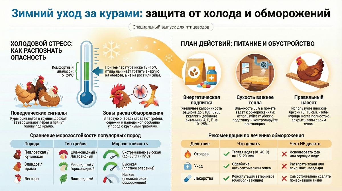 Многие начинающие птицеводы с ужасом ждут первых серьезных заморозков, представляя, как их подопечные превращаются в ледяные фигурки. Существует миф, что курица — птица тропическая и при нуле градусов она уже страдает. Но так ли это на самом деле? Правда в том, что куры — невероятно выносливые создания. Их предки действительно жили в джунглях, но века жизни в суровом климате превратили их в настоящих экспертов по выживанию. Курица — это маленький живой обогреватель, который при правильном уходе может игнорировать даже сибирские морозы. В этой статье мы разберем, где находится предел прочности домашней птицы, почему влажность опаснее холода и как помочь вашим пернатым перезимовать с комфортом и свежими яйцами в гнезде. Для начала важно понять: нормальная температура тела у курицы составляет 40–42 градуса. Это намного выше, чем у человека. Чтобы поддерживать такой жар, птица тратит огромное количество энергии, получаемой из корма. У кур есть так называемая термонейтральная зона — это диа
