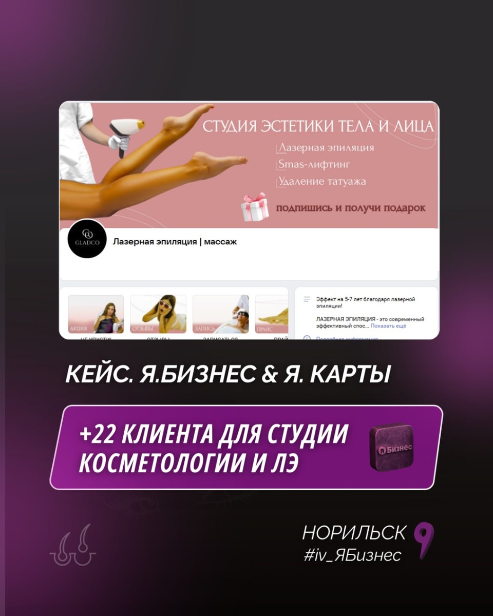 +22 новых клиентов и больше 120.000р для студии эпиляции в Норильске через Яндекс Карты. Изначальное присутствие на Яндекс Картах - есть. Цель - обновить все информацию, заполнить разделы, собрать рекламную компанию и запустить рекламу для увеличения потока трафика и немного подвинуть конкурентов. Что делаем для карточки в Яндекс Картах: ✔️ Заполняем все разделы с информацией ✔️ Обновляем фото и видео (все сортируем по разделам как положено по охватам и привлекательности) ✔️ Вносим недостающие контакты и ссылки, время работы и ключевые слова; ✔️ Создаем товары и услуги вручную + добавляем СЕО описание ✔️ Заполняем вечные истории ✔️ Добавляем 5 - 7 новых публикаций в новостях Собираем рекламную подписку (что сюда входит): 🔖 Заполнение анкеты и описания (+ключевые слова для поиска) 🔖 Оформление карточки компании на картах 🔖 Добавление акции (1-5шт) 🔖 Добавление витрины в карточке компании (1-20 товаров или услуг) 🔖 Добавление 20 объявлений для РСЯ (контекстная реклама) 🔖 Подк