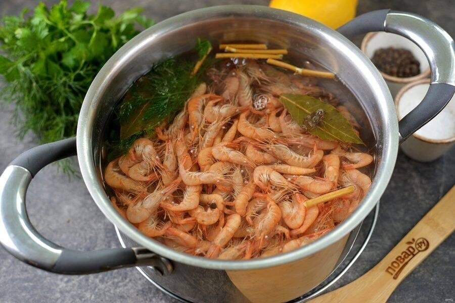 1. Как варить свежемороженые или охлажденные креветки (в панцире)