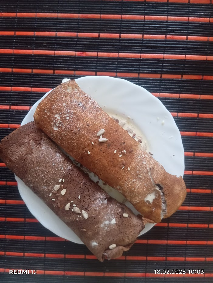 1 яйцо., столовая ложка воды, пол чайной ложки какао. Всё размешивается и жарится с двух сторон.