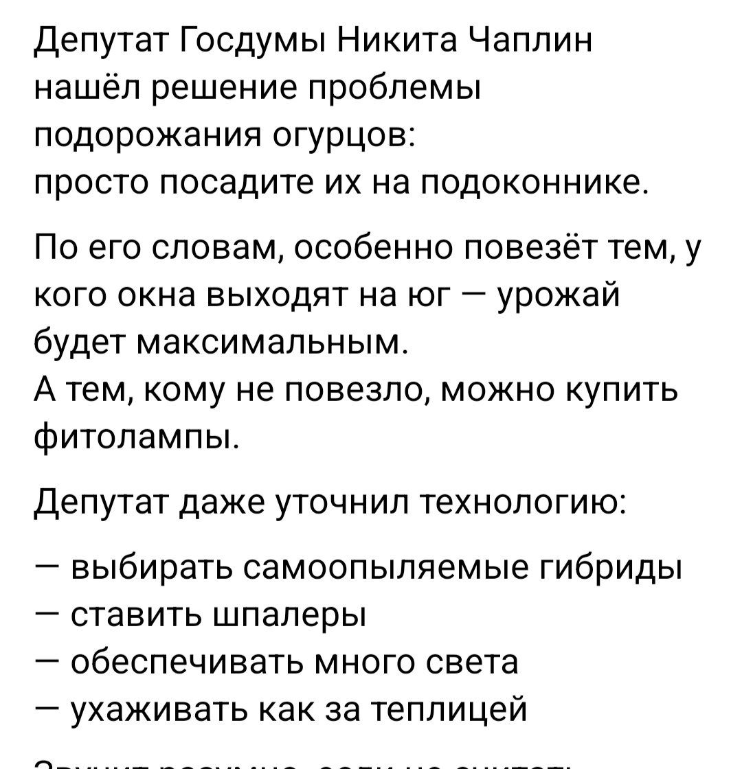Уже неделю не дает мне покоя новость о том, что депутат Никита Чаплин дал совет россиянам выращивать огурцы на подоконнике.