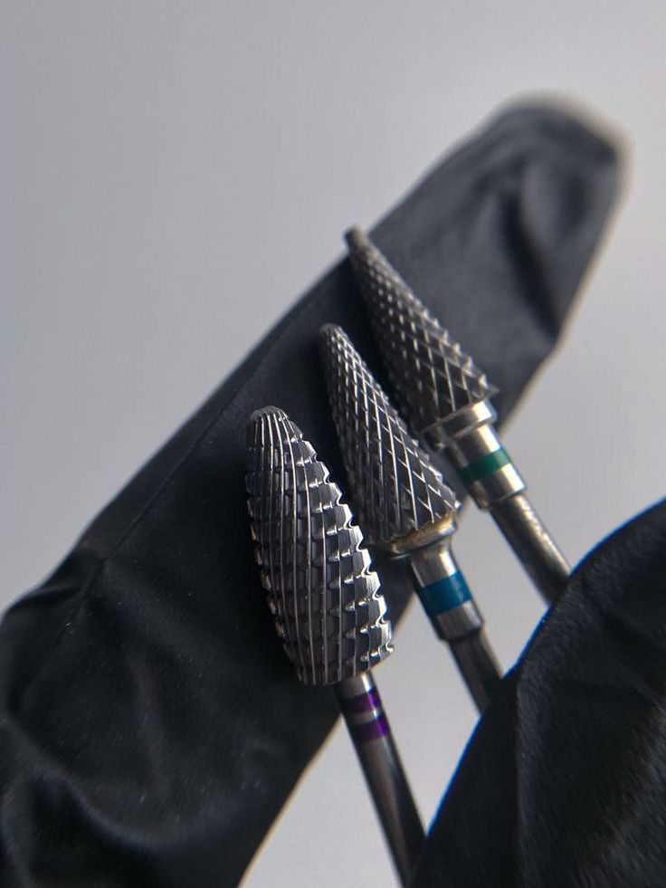- Твердосплавные (металлические). У них есть насечки, и они работают по принципу срезания материала . Это мощные насадки, но для новичков они могут быть агрессивны. Их основная задача — снятие плотных искусственных покрытий (гель-лак, акрил). Для натуральных ногтей и нежной кожи они не подходят, так как могут повредить пластину .