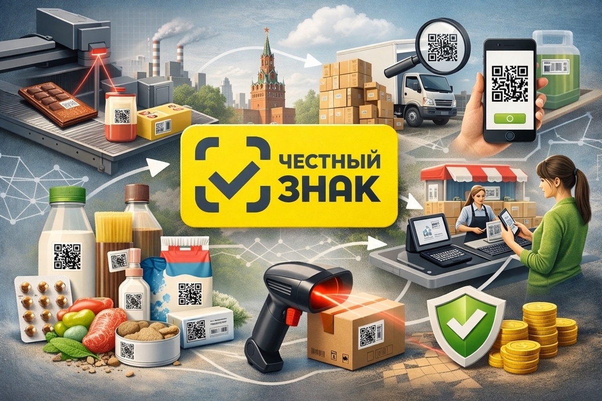 «Честный знак» — это государственная система цифровой маркировки и учета товаров в России. Каждый маркируемый товар получает уникальный код DataMatrix, который связывается с его жизненным циклом: от производства или импорта до продажи покупателю. Система помогает отслеживать движение товаров и блокировать нелегальные, контрафактные и просроченные позиции.
