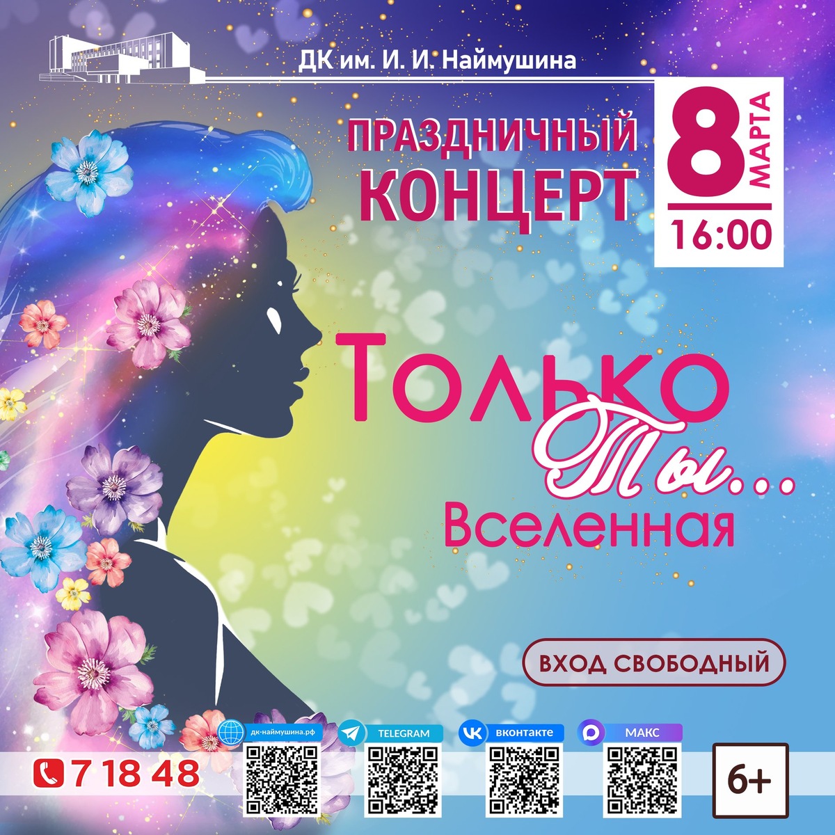 И. Наймушина приглашает на традиционный праздничный концерт, посвящённый Международному женскому дню, 8 марта. Только для тебя — весеннее настроение и праздник, наполненный лаской, нежностью и любовью. Ждём вас 8 марта в 16:00. Вход свободный. 6+