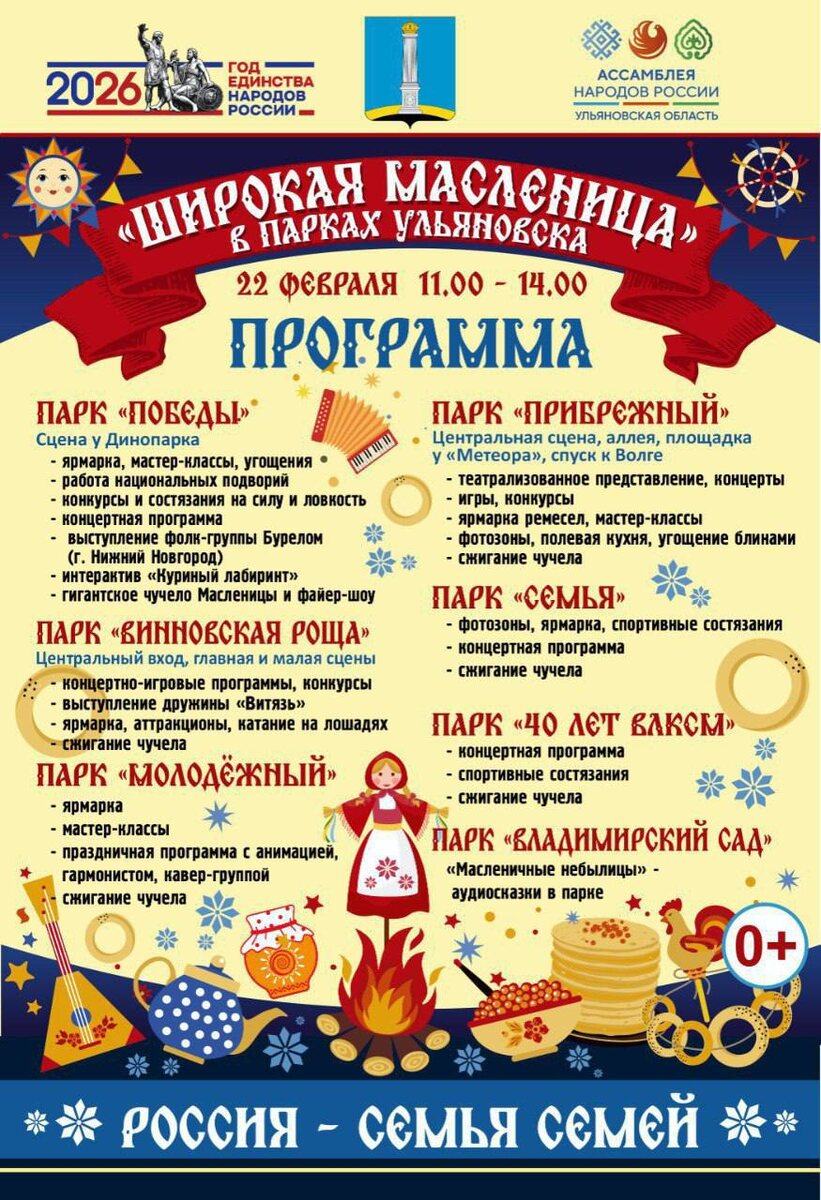 ! Парки Ульяновска приготовили насыщенную программу празднования проводов зимы. 22 февраля | 11:00–14:00 Готовы отведать блины с пылу с жару, принять участие в народных забавах, услышать музыку, смех, посетить ярмарки и огненно попрощаться с зимой? ☀️Парк «Победы» — фолк-группа «Бурелом», «Куриный лабиринт», гигантское чучело и зрелищное файер-шоу. ☀️«Винновская роща» — дружина «Витязь», катание на лошадях, состязания богатырей и шумная ярмарка. ☀️ «Молодёжный» — аниматоры, гармонист, интерактивы и живая музыка. ☀️ «Прибрежный» — театрализованное представление, блины, фотозоны и полевая кухня. ☀️«Семья» — спортивные игры, концерт и уютные фотозоны. ☀️«40 лет ВЛКСМ» — активные забавы и праздничная программа. ☀️«Владимирский сад» — «Масленичные небылицы»: гуляем и слушаем сказки. Оперативные новости в МАХ